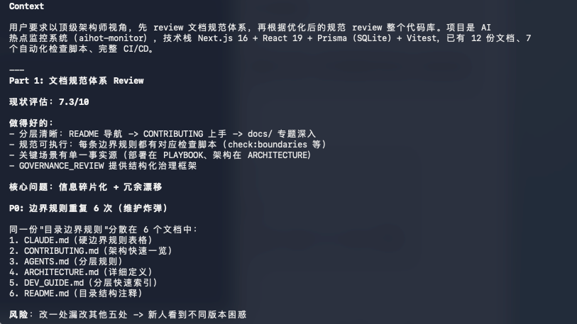 就比如说,我让他之前对我的一个AI热点网站的项目进行审查,主要就是review一下我的文档规范和我整个代码库。